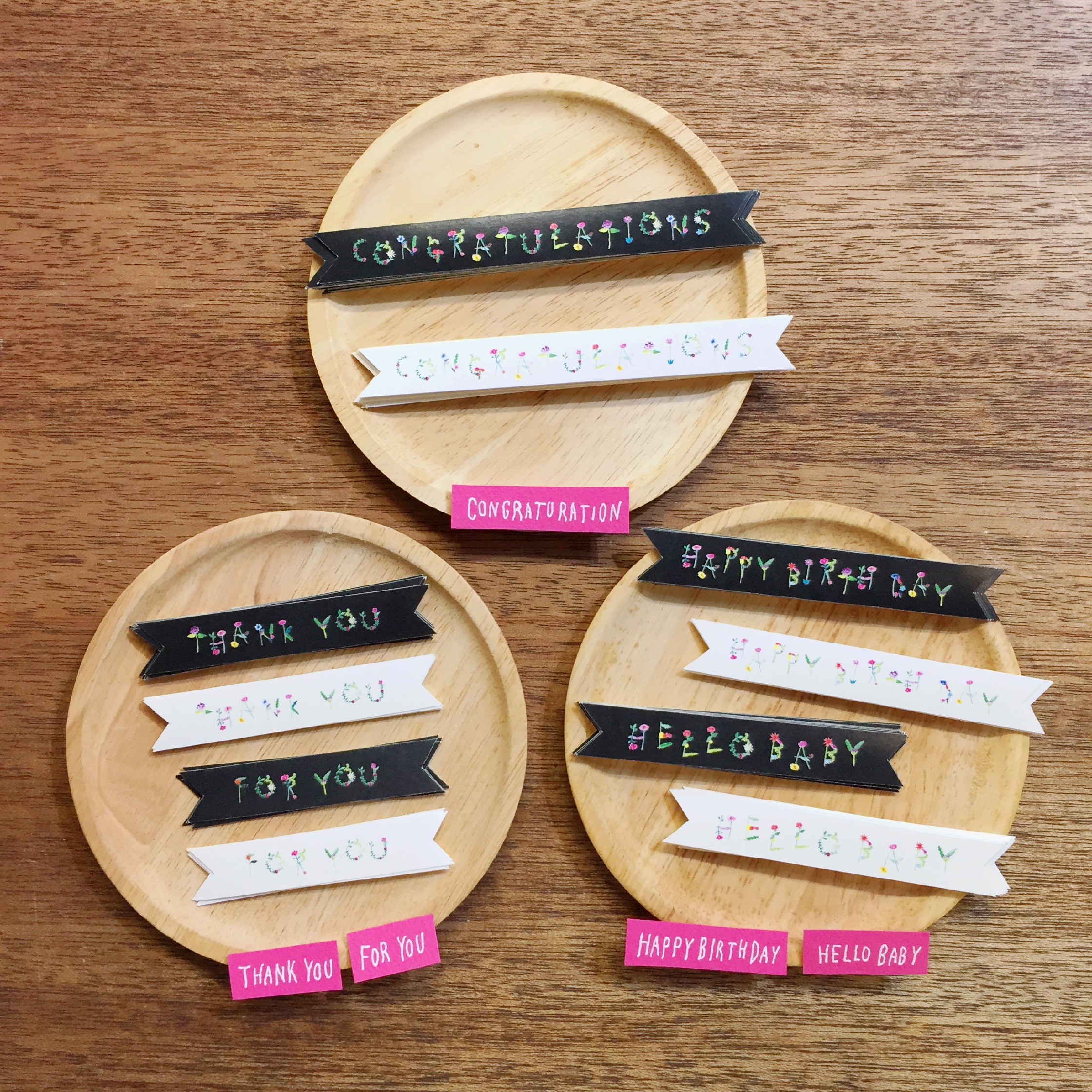 リボン型のメッセージシール(¥50~¥70)も全て花文字で綴られていて封シールとして使ってもとっても可愛いです!
